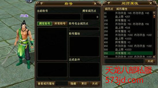 称号系统中引入阅历的概念,附带有"阅历点"属性。当玩家获取一个称号的同时,也会获得包含在称号中的阅历点。。每个称号带有的阅历点为0--5点不同。当阅历点累加到一定点数的时候,能够激活隐藏属性。阅历点积累更高,能够获得更多条目的隐藏属性。