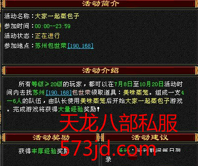 1、队长右键点击包裹道具栏里的(美味蒸笼),进度条读完后,地面出现一个美味蒸笼NPC,此时每人被随机分配到某种包子(豆沙包,灌汤包,大憨包),全体准备好后,NPC放置人对话---开始游戏---选择即将被蒸掉的包子,队员对话---同意/更换即将被蒸掉的包子,全体同意后,被蒸掉的包子受到定身1秒(自动定身)与变身(持续90秒,自动变身)处罚,获得少量经验。未被蒸掉的包子获得大量经验(经验多少视被蒸掉的人数而定,被蒸掉的人数越多,获得经验越多)。